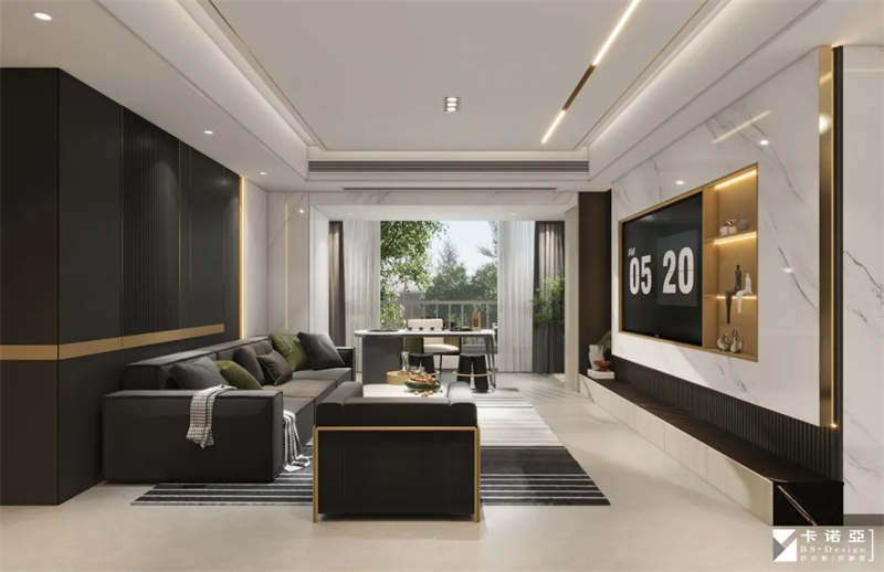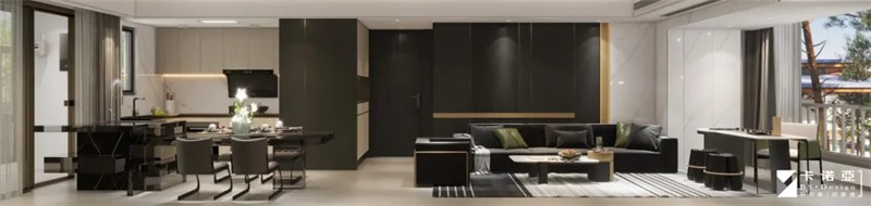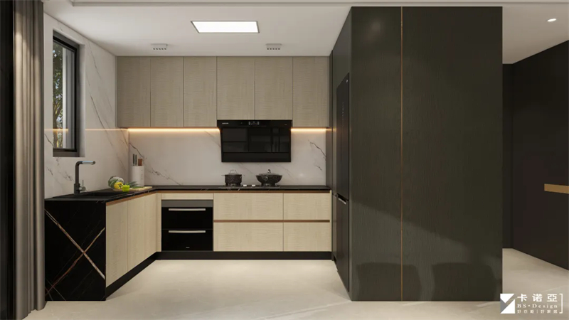 ③厨房接纳高等黑+白撞色设想,温馨木色减缓空间冷感