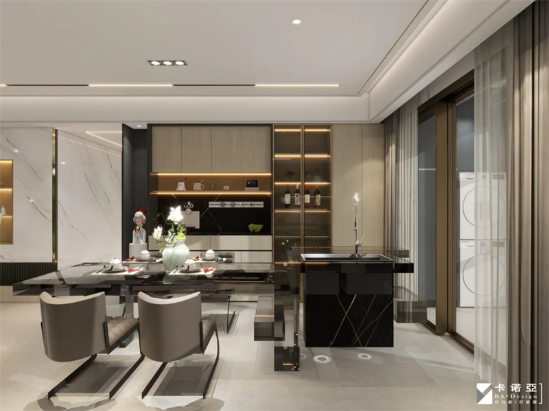 ②餐厅与阳台一体,用岛台奇妙隔绝距离,一侧用餐一侧家政