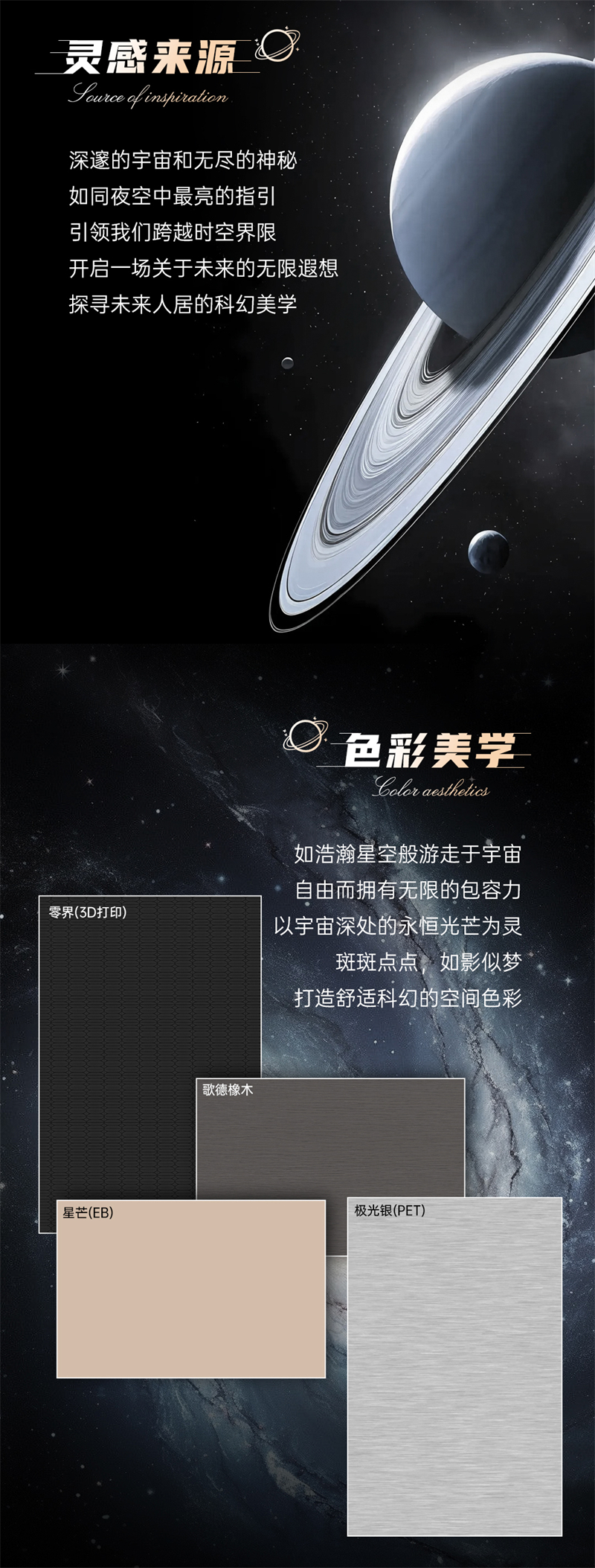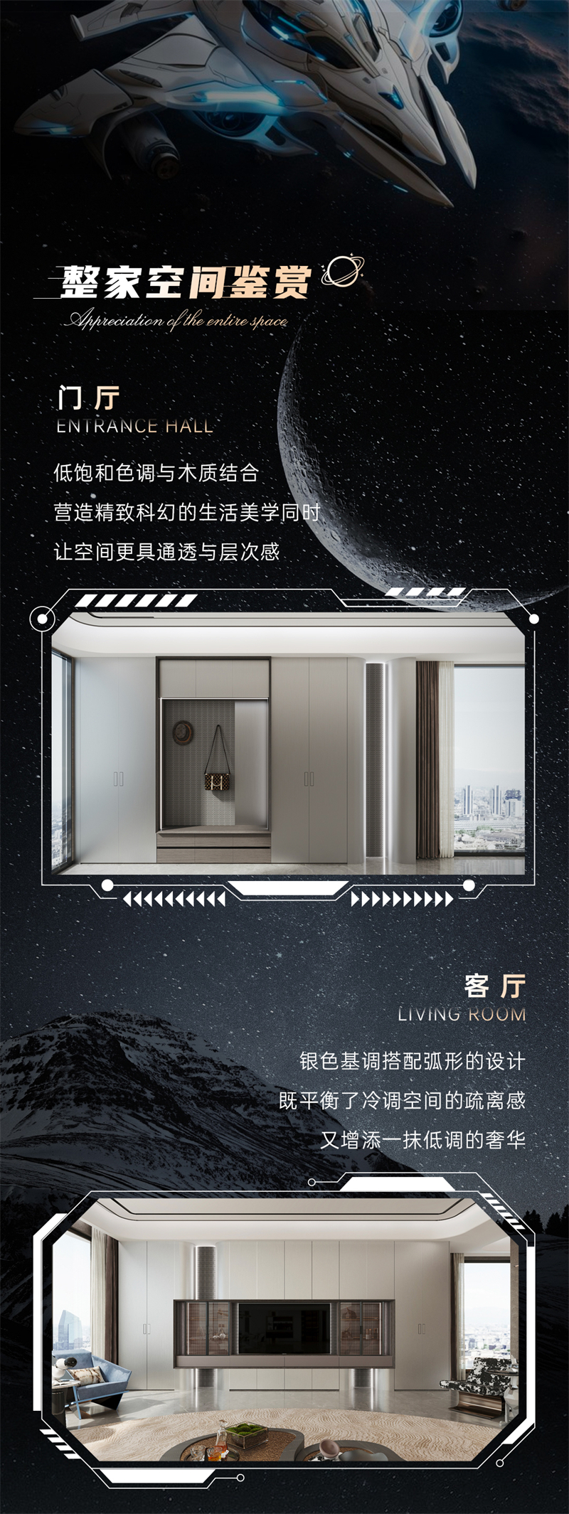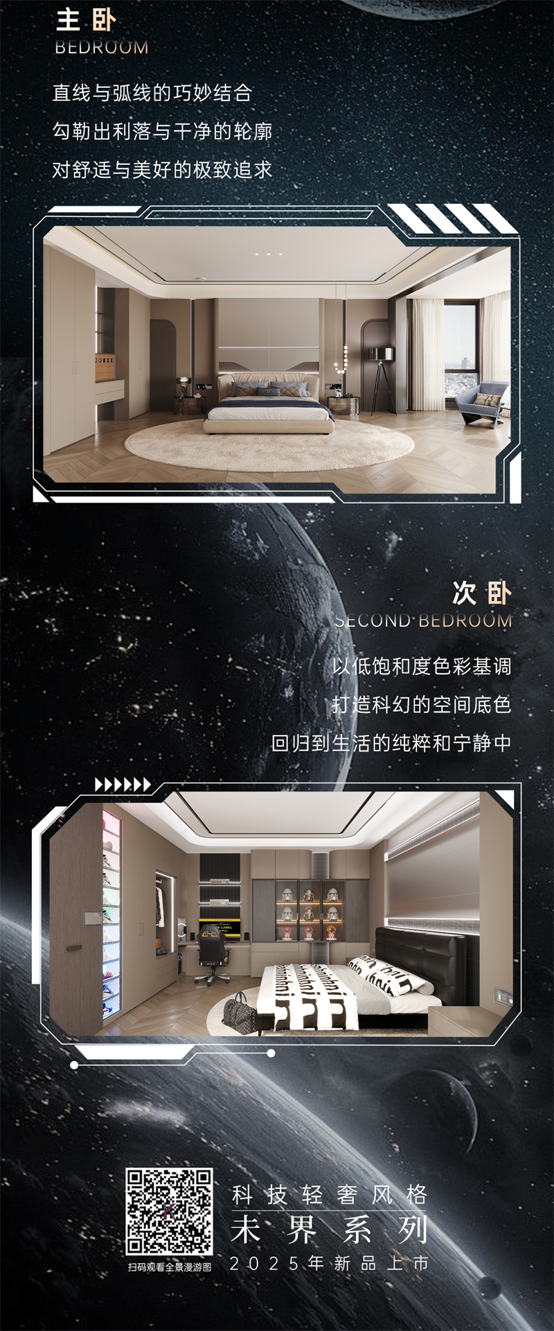 2025年新品系列,未界系列 |科技轻奢气概以科技青年(航天设想师、汽车工程师、科技创业者等)职业特征为焦点,融入航天元素与汽车模子揭示,借助流利线条、科技灯光,搭配智能家居,营建将来感空气,知足对科幻的联想,完成科技与糊口的融会,揭示摸索精力。