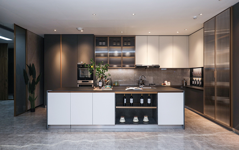 一柜到顶(ding)整(zheng)理超极,中岛台(tai)参(can)与(yu),时候(hou)始终坚持不锈钢𝓰台(tai)面齐整(zheng),长(zhang)虹磨(mo)砂玻(bo)璃与(yu)无门(men)拉手门(men)边作明佛(fo)母心ꦫ咒,让家庭厨房简雅而晶(jing)莹(ying)。