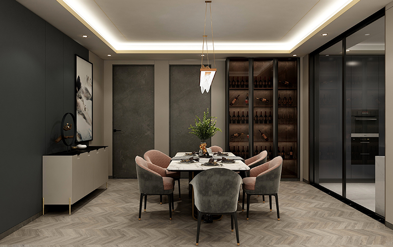 中档(dang)黑灰的(de)玻璃隔断门(men)餐(can)(can)洒柜,门(men)到顶,展露非常多酒类,充分彰显业主卓越牙嚼。粉红(hong)中等职业丝绒餐(can)(can)桌椅子(zi),热分解简约时尚(shang)禁(jin)欲系范,让就餐(can)(c💛an)增(zeng)进无(wu)间。