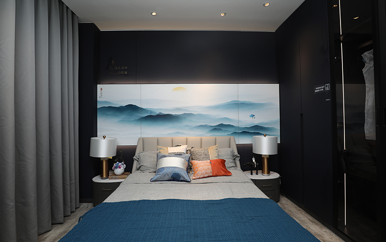 卧室床护竹炭护墙板3D新中式群山画,艺术境(jing)界(jie)很(hen)远,美丽无言。橱(chu)柜(ju)潮流的(de)꧙“浩(hao)大深蓝(lan)”门边配上肃静严格的(de)“黑金(jin💖)刚”柜(ju)门,再展深挚的(de)艺术其内在。