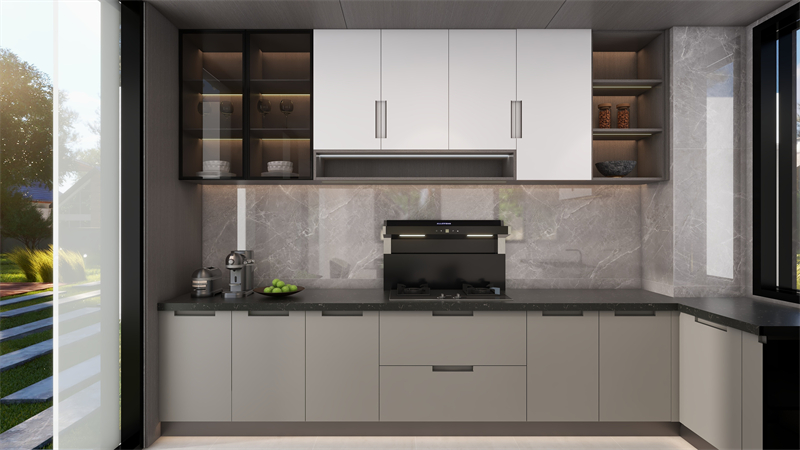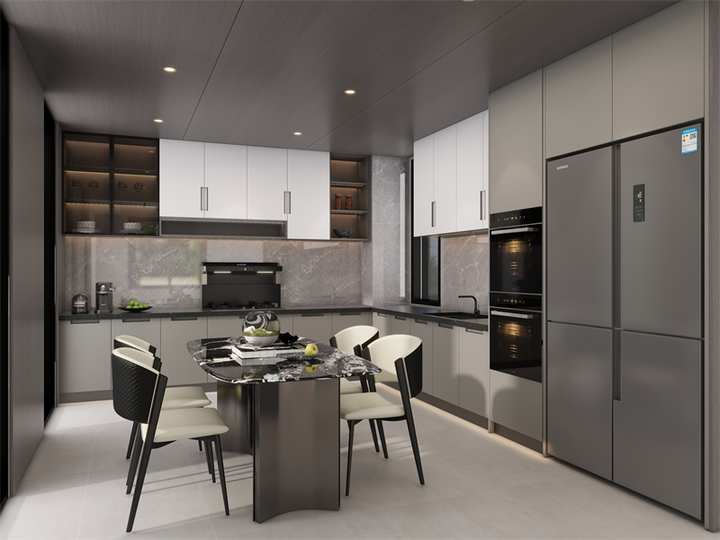 吊柜(ju)和地柜(ju)离别时配(pei)上“晨露白”和“薄暮灰”,前面(mian)之(zhi)效大理(li)市石(shi)纹,一抹阳光倘佯(yang),炊火气劈面(mian)出来。全队(dui)視覺清(qing)洗(xi)下垫面(mian),安全安装玻璃门装𝐆饰(shi),进一步(bu)强(qiang)化(hua)視覺透光感与头(tou)绪感。