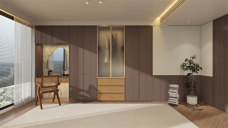 大的部分余地以棕色木质(zhi)纹(wen)理内搭,大占地的木质(zhi)纹(wen)理拼框(kuang)柜(j﷽u)门,既抹去中(zhong)大气(qi)主(zhu)义范基本特(te)征,也兼(jian)具(ju)大气(qi)主(zhu)义与古(gu)典艺术美。柜(ju)子的部分进行长(zhang)虹玻(bo)离(li),置于穿衣服台,搭配组(zu)合镶入led灯条,透光不(bu)投影仪的昏黄(huang)感,高(gao)贵(gui)冷艳每顿饭。