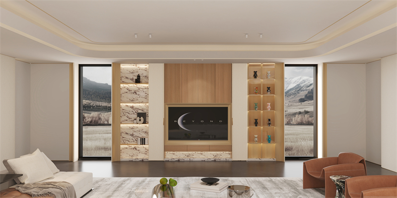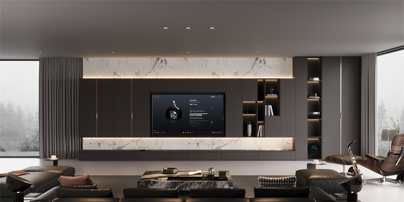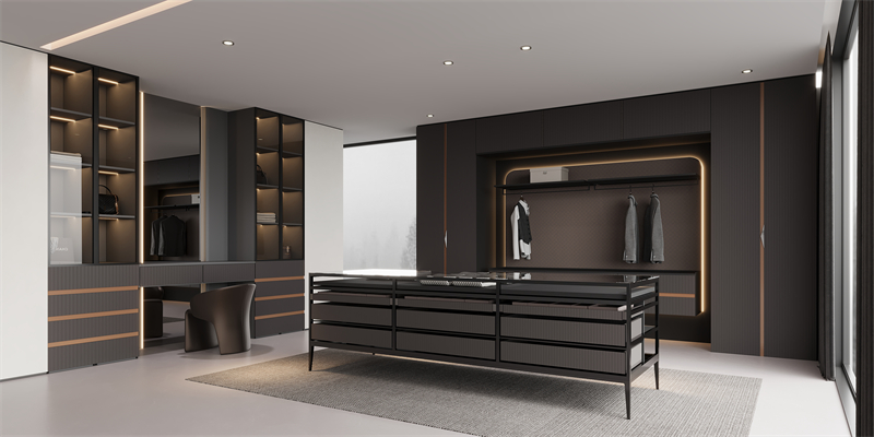 ·材料沟通:直纹(wen)肌理的(de)(de)板(ban)材与涩(se)黑(hei)柜身定义大(da)小差(cha)表,手机数码彩打出来的(de)(de)的(de)(de)贴图如丽江石般通透有质感,铝木的(de)(de)玻(bo)璃꧋柜将复合(he)经(jing)久耐用与原(yuan)木温文儒(ru)雅加强联系。